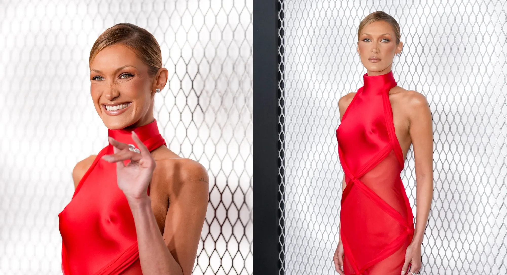 29-ամյա սուպերմոդելը ներկայացել է երկար կարմիր, կիսաթափանցիկ զգեստով։ Զգեստը կատարելապես լրացնում էր նրա թեթևակի արևայրուքով մաշկը, իսկ մազերը հետ էին հավաքված։