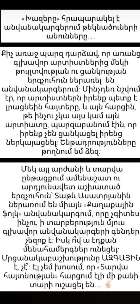 «Մեկ այլ արժանի և տարվա ընթացքում ամենաշատ ու արդյունավետ աշխատած երգչուհուն՝ Տաթև Ասատրյանին ներառում են միայն «Քաղաքային ֆոլկ» անվանակարգում, որը չգիտես ինչու, ի տարբերություն մյուս գլխավոր անվանակարգերի, գենդեր չեզոք է։ Իսկ ո՞վ է այդքան մենահամերգներ ունեցել։ Մրցանակաբաշխությունը ԱԶԳԱՅԻՆ է, չէ՞»,– գրել է նա։